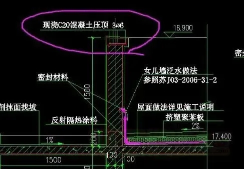壓頂處于屋面的最高處,直接暴露于自然狀況中,受天氣影響大,受整個縱向墻體溫差、構(gòu)造受力變形及墻體混凝土和沙漿干縮變形的影響也很大,因而即便是配筋混凝土壓頂,其橫向破綻也是不可避免的。多在3~5年內(nèi)破綻均會鮮明地展開,配筋混凝土壓頂,在5~8m以內(nèi)就會有1條破綻展開,不配筋混凝土在1m支配就有1條破綻。雨水順破綻到墻內(nèi),繞過防水層漏到室內(nèi),以是壓頂必需作柔性涂料加強層。普通是作在壓頂下,假定選材不當,或許會組成壓頂和女兒墻分層,目前只需聚合物水泥基涂料和聚合物水泥沙漿概略用于此處防水;另一種是將防水層作在壓頂下面,采取卷材粘貼或用涂料涂刷。